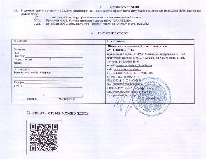 После установки счетчиков, мастер дописал требуемое со своей стороны в договор и назвал стоимость работ - 8800р.