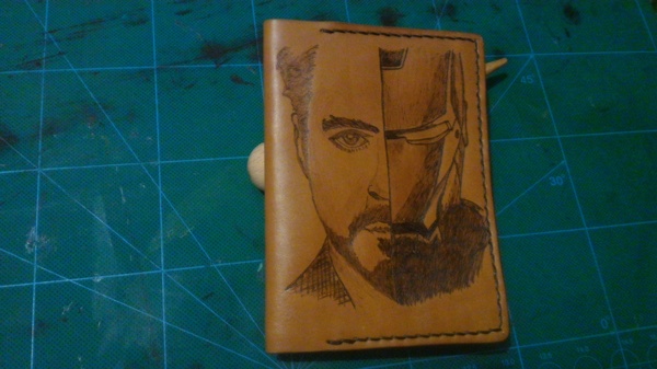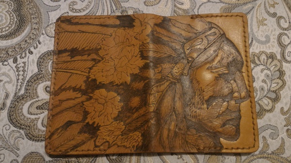 Ну и немного о процессе: рисунок взят из интернета, переведен через обычную копирку, выжигатель обычный *дымок*, а вот игл две, обычная и для гильоширования. После окончания выжигания пропитано сапфировским гелем, плюса в этом два: водозащита и то, что кожа смягчается и ее можно обратно расправить после выжигания. Нитки ритс тайгер 1мм, советую, не нитки а экстаз. Фаска с краев снята, край обработан седельным мылом и по нему заполирован. Если есть вопросы с удовольствием отвечу.