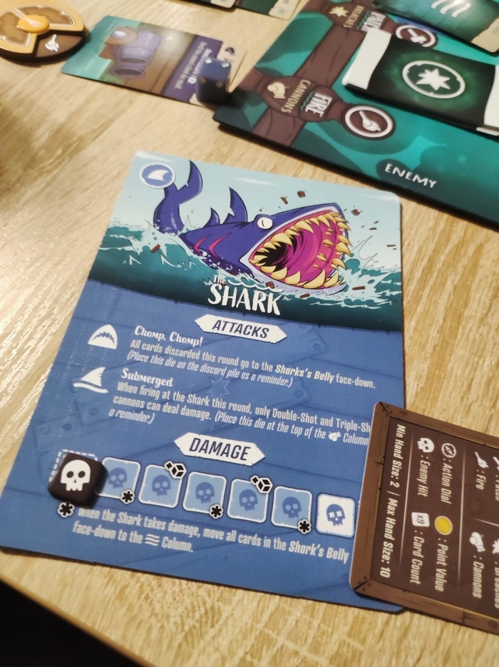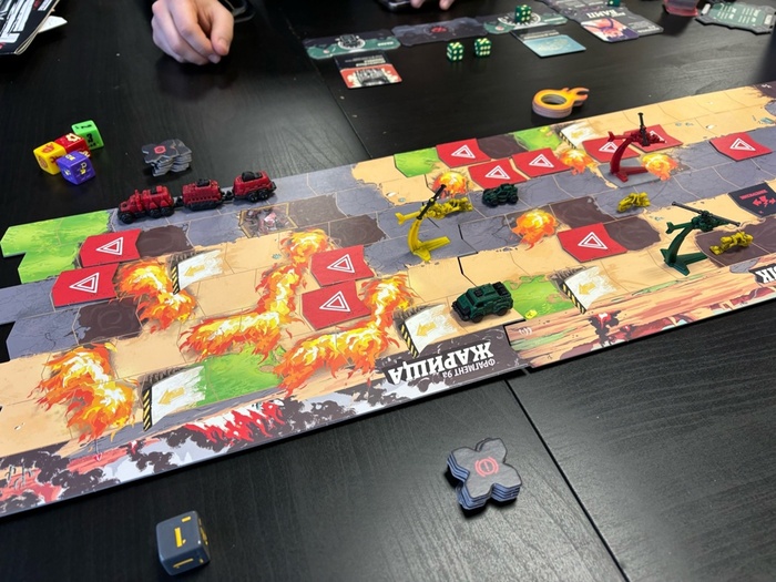 Но есть, конечно же, и ложка дегтя. Во-первых, у поезда все кубики с максимальной гранью - 3. Это очень больно, потому что многие команды требуют не менее тройки (особенно ремонт, а повреждаться вы будете на каждом шагу) - и пес бы с ним, что вы не так быстро катитесь, зато трижды в ход!. Во-вторых, автопоезд обязан потратить кубик на сервопривод, чтобы иметь возможность поворачивать из полосы в полосу. ... казалось бы, весомое ограничение, но иной раз тебе оно и нафиг не упало, потому что ты большой и тяжёлый, и ты сносишь все на своём пути. Но если вы плохо кидаете кубы, и вы не можете чиниться, скорее всего вы не доедете до финиша, даже если вас не трогают - потому что при каждой попытке вас сдвинуть с места каким-либо сторонним эффектом, у вас "ломается" одна из команд (кроме ремонта).