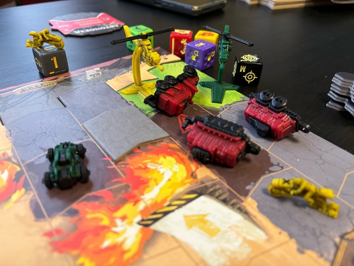 Первым я бы выделил невероятную эмоциональность и весёлость игрового процесса. У тебя на поле творится хаос, что-то постоянно происходит, творится какой-то ад и хаос: кто-то взрывается, кто-то безуспешно пытается обстрелять грузовик, и у него это не выходит, кто-то подпрыгнул на трамплине и ушатался об гору, кто-то перекрыл автопоездом узкий тоннельчик, и теперь все об него бьются, а он сам не может сдвинуться с места. Кто-то влетел в жетон опасности, там случилось землетрясение, в результате половина машинок улетела с трассы. Да, это весело, пусть и хаотично.