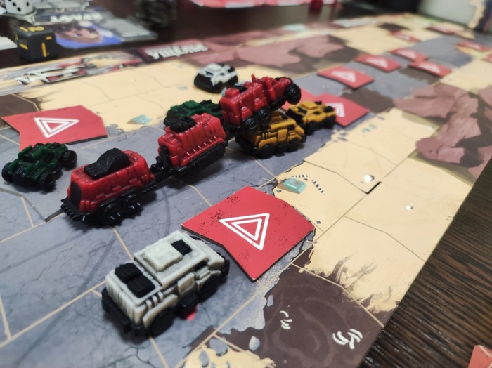 Автопоезд - здоровая дура, которая свысока смотрела на все препятствия, непроходимые местности и прочее... она их просто уничтожает на своём пути, получая незначительные повреждения - БЕЗ каких-то дополнительных эффектов - отброса в сторону, пожара, длительных неполадок. Кроме того, у него на каждом из 3 вагонов есть свои команды. То бишь - вы за свой ход двигаете 3 машинки и делаете одну команду, а он все это время ПОСТОЯННО едет, да еще при этом, сука, что-то да активирует! Поездом можно игнорировать жетоны опасности - просто сбрасываешь жетончик, и вместо него появляется дорога, что иной раз очень ценно, учитывая, что там могут быть и мины, и трамплины, и всякое прочее дерьмо, и шаи-хулуд, который уничтожает машины, и землетрясение, которое всех мотыляет туда-сюда, у поезда, конечно же, тоже есть авиаудар, у него есть опция выкладывать за собой жетоны опасности...