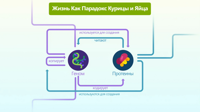 Если очень упростить, то проблема в том, что для существования генома, нужны протеины, а чтобы создать протеины, нужен функциональный геном. И протеины и геном это очень длинные молекулы, состоящие из довольно сложных блоков, и получить их случайно невероятно трудно. Это парадокс курицы и яйца, только со множеством куриц и яиц.