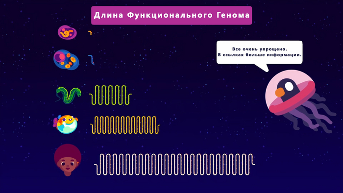Геном можно представить в виде длинной цепочки символов с биологическими инструкциями. И от микробов до современных людей, размер функционального генома увеличивался с примерно постоянной скоростью. Функциональный геном рыбы примерно в два раза больше, чем у червя. Наш геном примерно в два раза больше рыбьего и так далее. Все немного сложнее, но пока давайте примем это на веру.