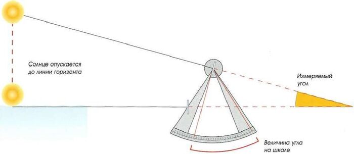 Трубка, через которую видно горизонт и зеркало расположенное перед ним, и второе зеркало которое двигается при помощи лимба. Второе зеркало двигают так, чтоб оно отразило солнце в первое. Тогда перед наблюдателем в трубке будет видно и солнце и горизонт. У на лимбе -будет угол возвышения солнца над горизонтом (см ниже картинки)