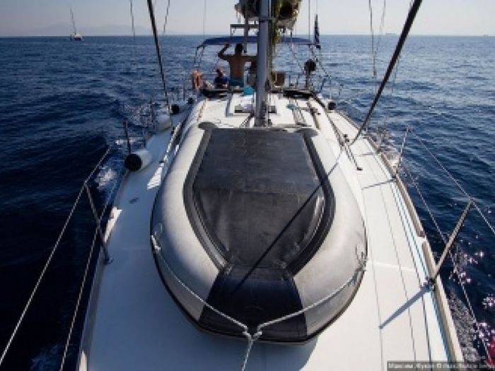 Поставили парус, базово провели обучение рулению и А. и М. по очереди отстояли часовою смену за рулем. Перекусив по дороге, приготовленным Mayan и М. салатом и макарошками пастой, мы не снижая скорости двигались к нашей цели, благо автопилот позволял поддерживать курс, отвлекаясь на еду.