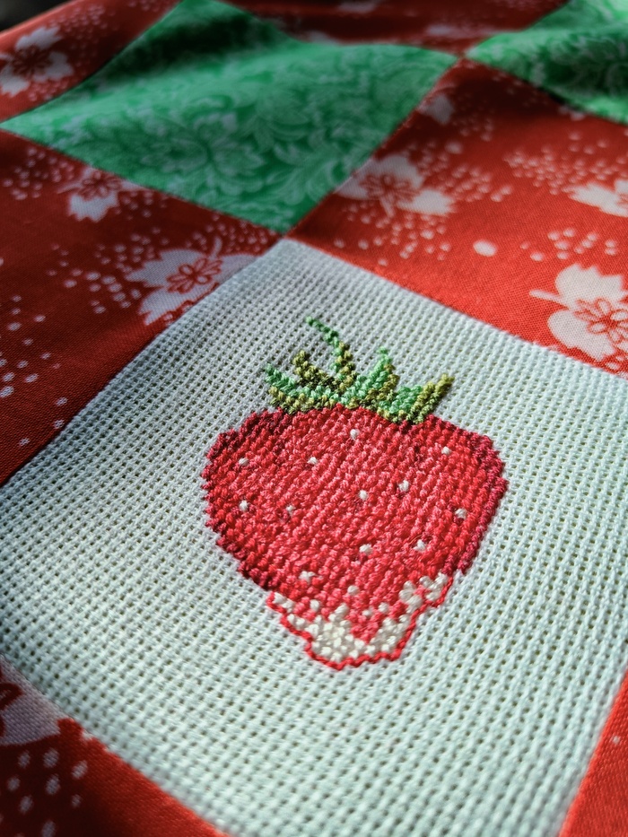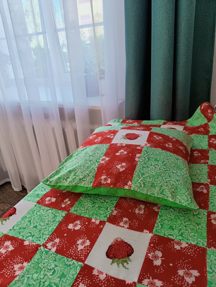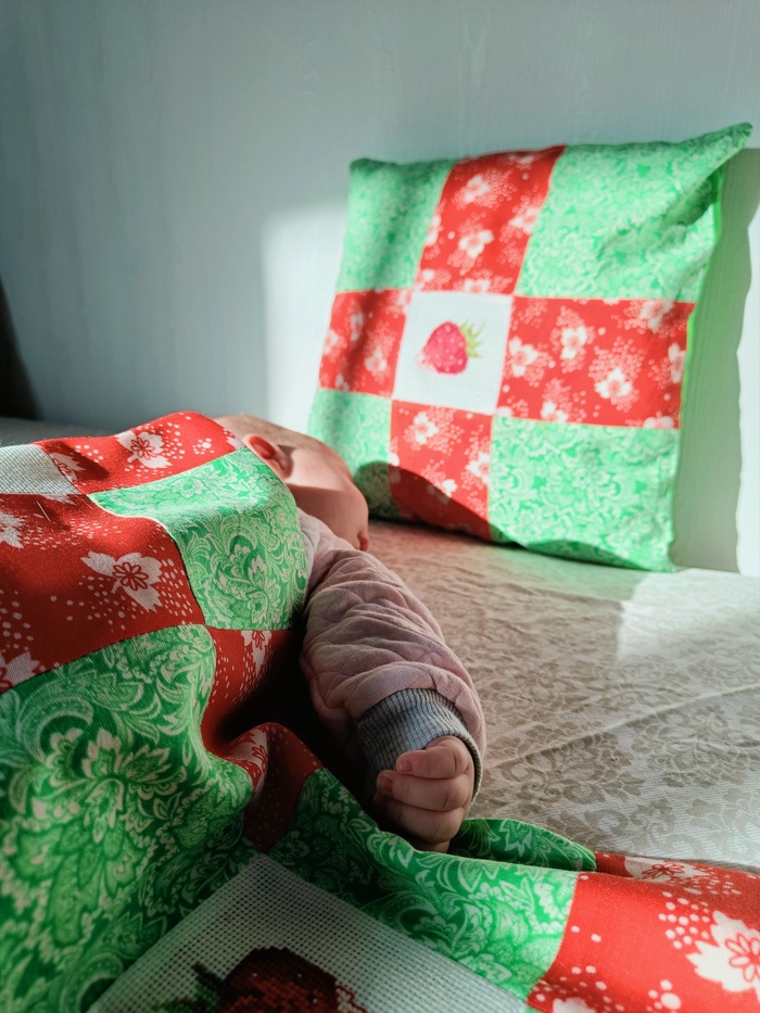 Так сложилось, что 12 лет назад я проводила свой декретный отпуск с родителями в селе. В деревне зимой особо нечего делать, кроме уборки снега, так что от скуки я начала вышивать крестиком. Однажды весь день вышивала ягодку, а ночью мне приснилось, что я укрываю сынишку ягодным пледиком. На следующий день обдумывала эту идею, а к вечеру совершила набег на шкаф. Два советских ситцевых платья были безжалостно порезаны на квадраты. Когда нельзя было шуметь, я тихонько вышивала ягодки. Процесс этот оказался долгим, а терпение мое коротким, да и сынок подрастал и требовал всё больше внимания. В общем, всё это дело было благополучно спрятано в пакет до лучших времён (пенсии, видимо).