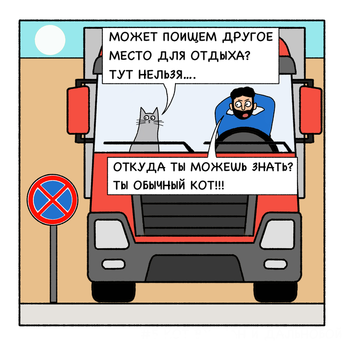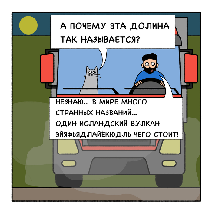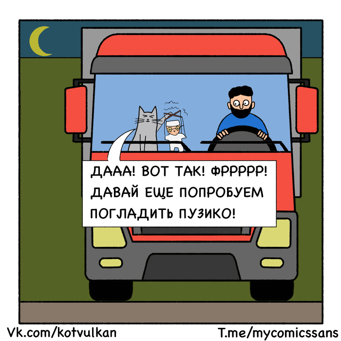 Кот Вулкан и дальнобой едут далеко-далеко. В дороге дальнобоя развлекает очень эрудированный и умный кот Вулкан.