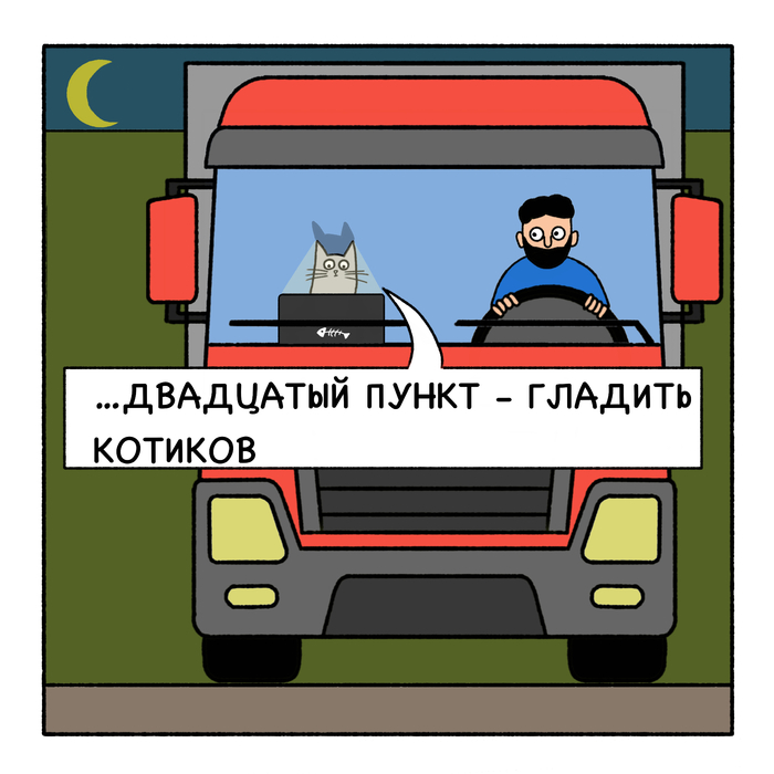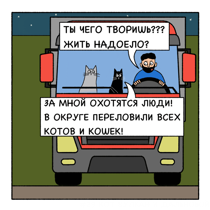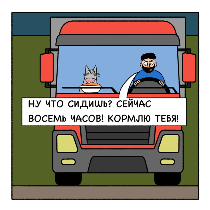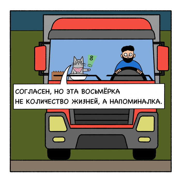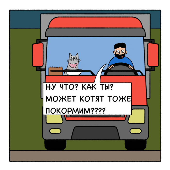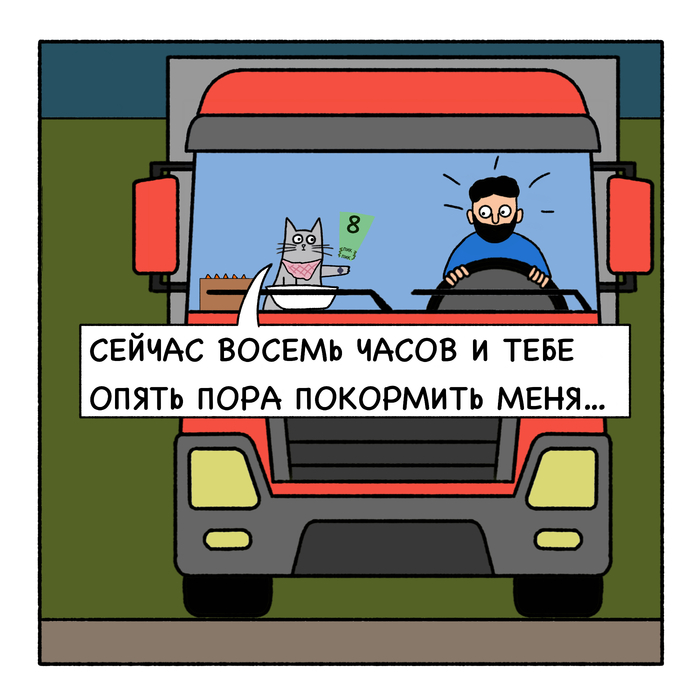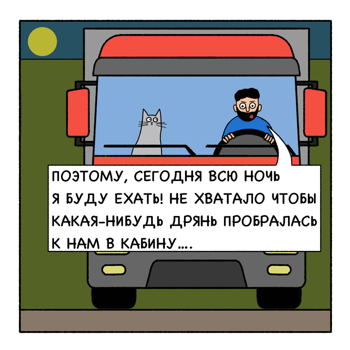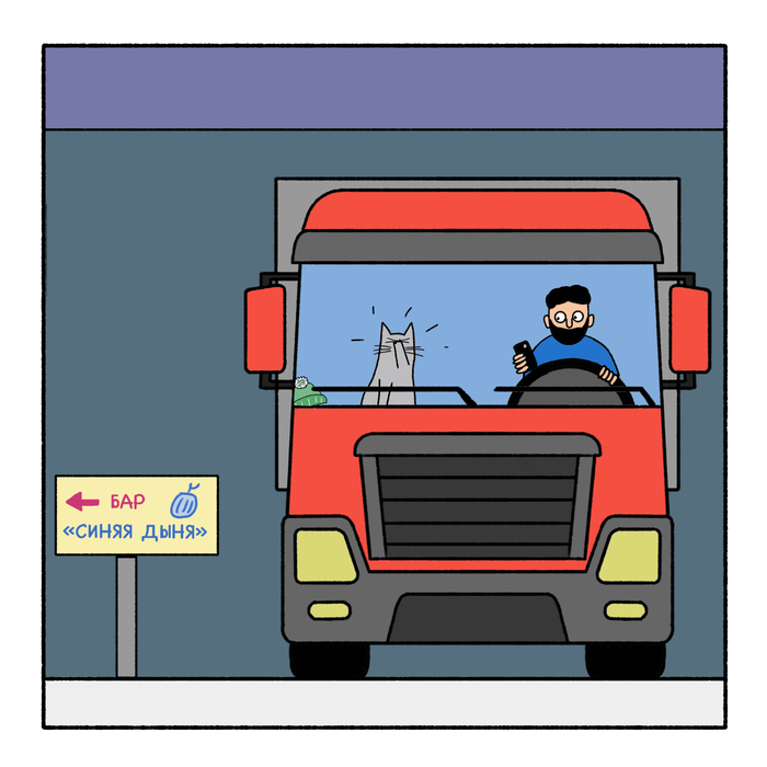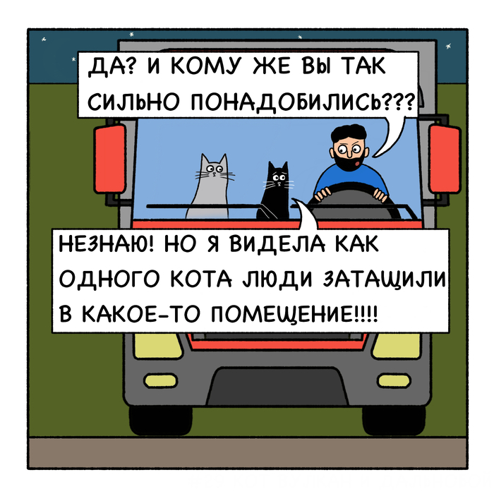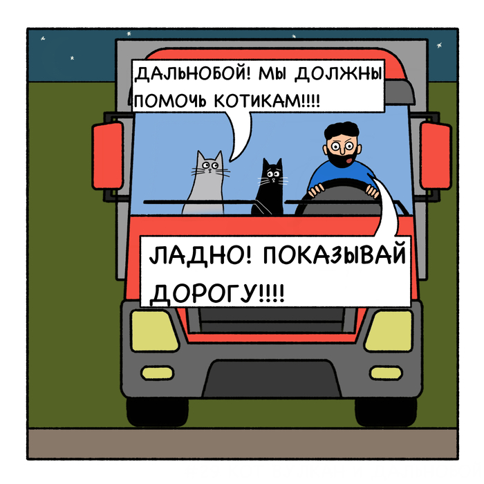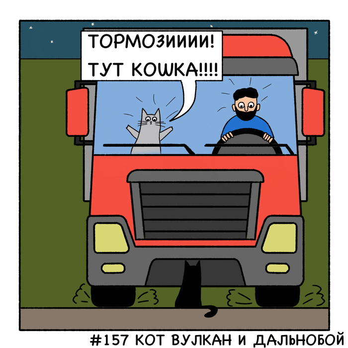 Кот Вулкан и дальнобой едут далеко-далеко. В дороге дальнобоя развлекает очень эрудированный и умный кот Вулкан.