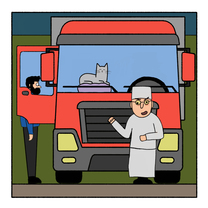 Кот Вулкан и дальнобой едут далеко-далеко. В дороге дальнобоя развлекает очень эрудированный и умный кот Вулкан.