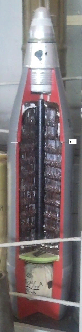 На фотографии - снаряд ЗШ1, начиненный готовыми поражающими элементами - флешеттами. Калибр снаряда - 122 миллиметра.