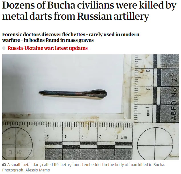 Перевод: Десятки жителей Бучи были убиты металлическими флэшеттами от снарядов русских орудий. На фотографии представлена сама флешетта - маленький металлический дротик, найденный в телах убитых. Для справки: вот статья о том, что конкретно это такое.