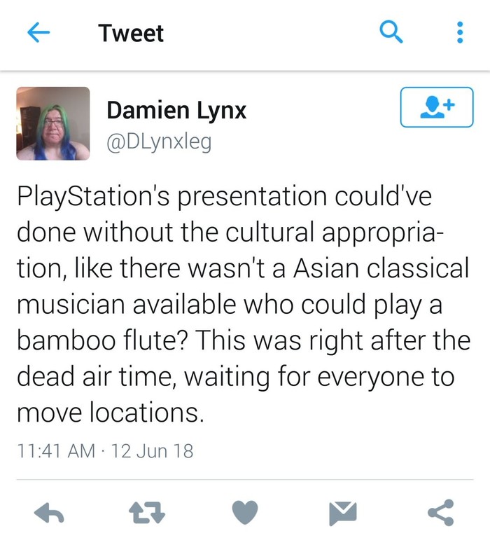 Презентация PlayStation могла бы обойтись без присваивания чужой культуры, как будто не было азиатского музыканта, который смог бы сыграть на бамбуковой флейте.....