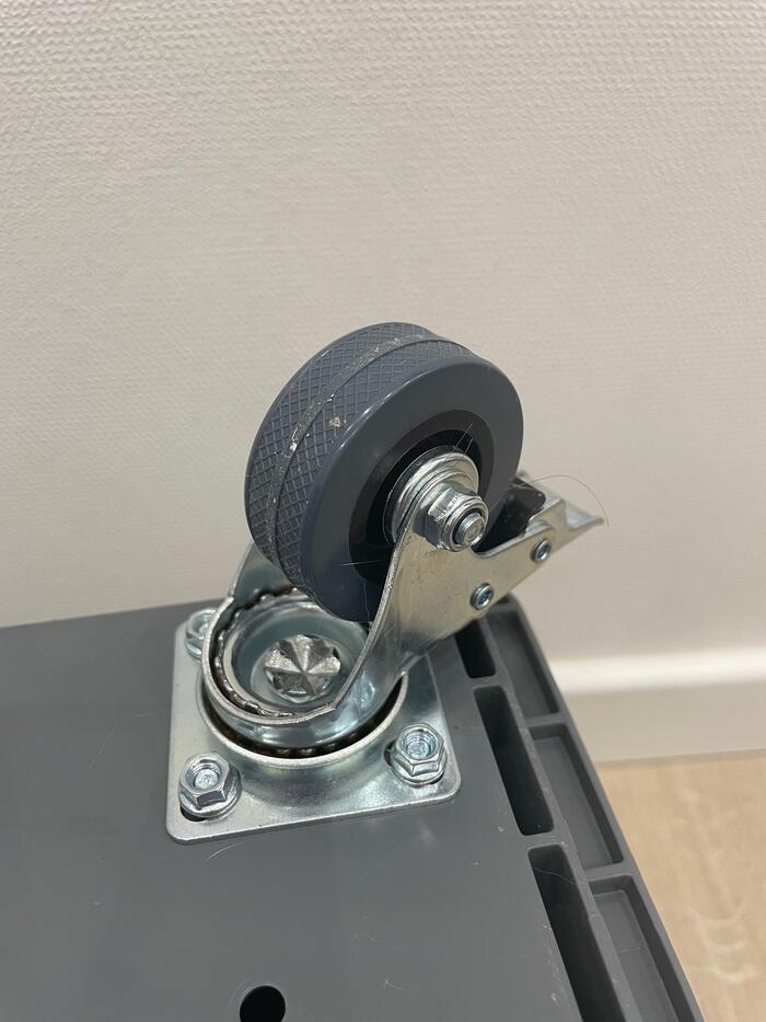 Начинаем с того, что крепим к нижнему базовому ящику колеса. Винт М5х10 на гайках с фланцем и шайбой. Были мысли усилить дно листом фанеры для исключения продавливания, но пока так.