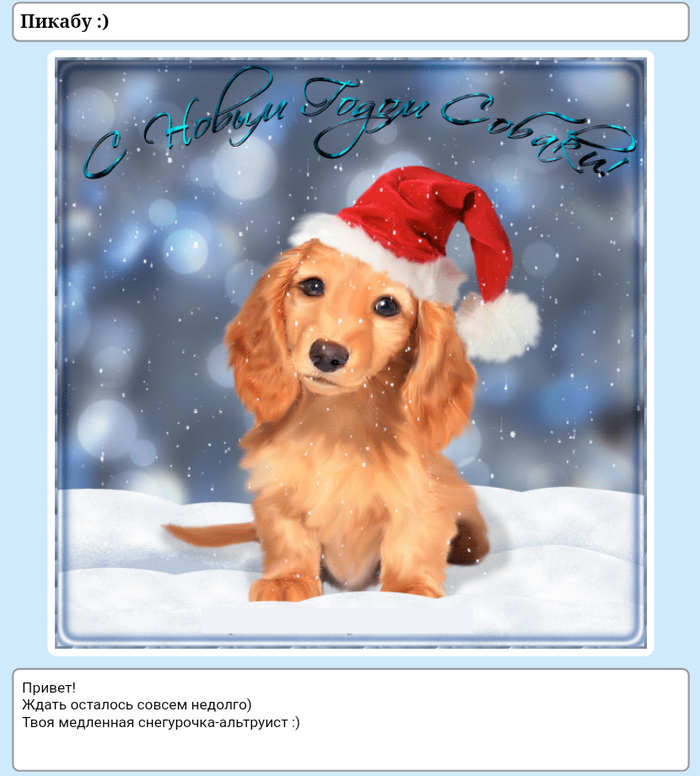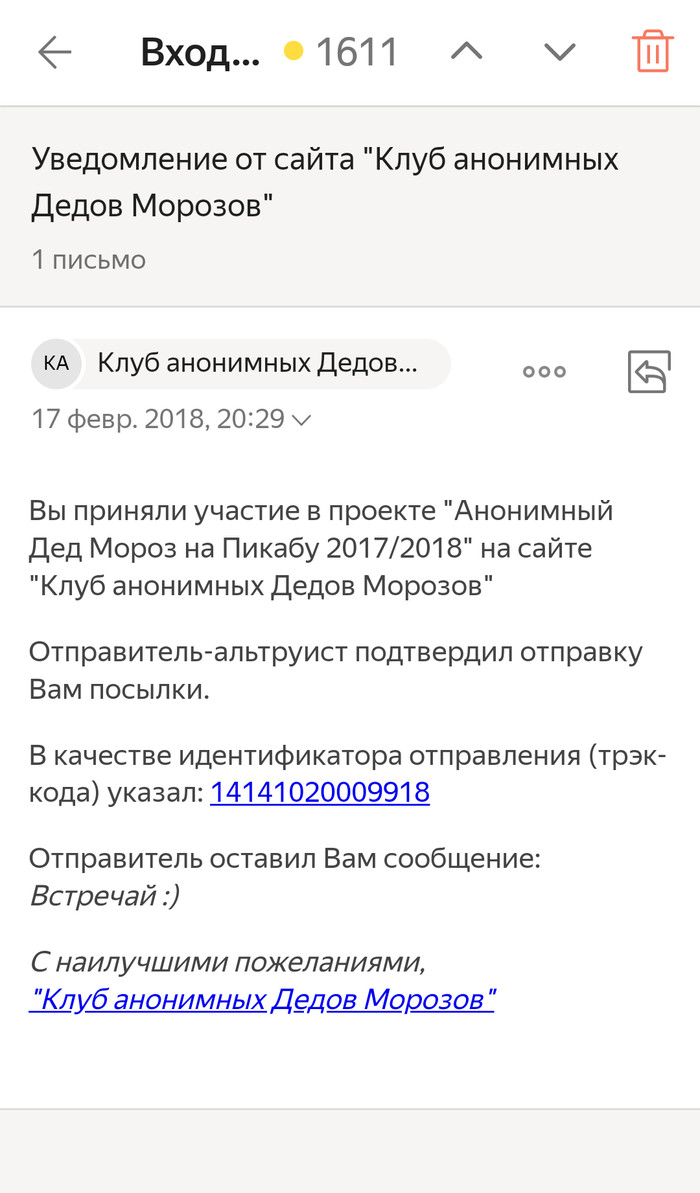 Я участвую в обмене новогодними подарками первый раз. Подарок от себя я собирала и отправила с удовольствием и радостью, а мой Дед Мороз пролетел мимо моего дома. Но Снегурочка Дарья про меня не забыла! Я уже и не надеялась получить подарок, но тут мне на почту пришла открытка, что мой подарок уже скоро придет!