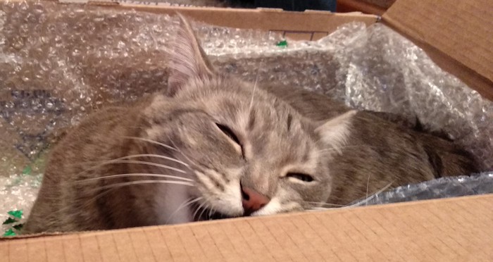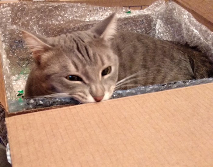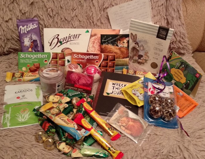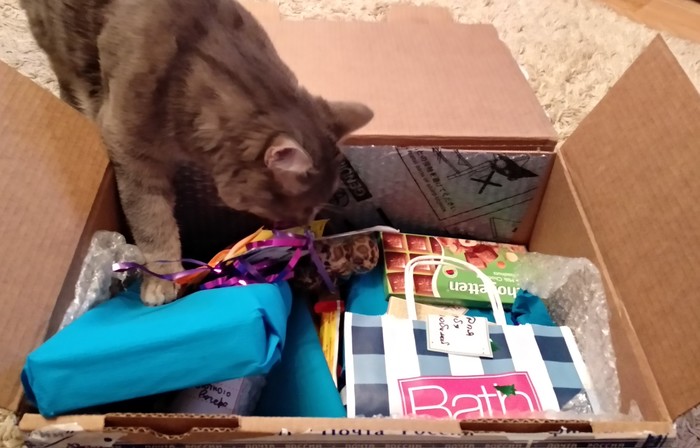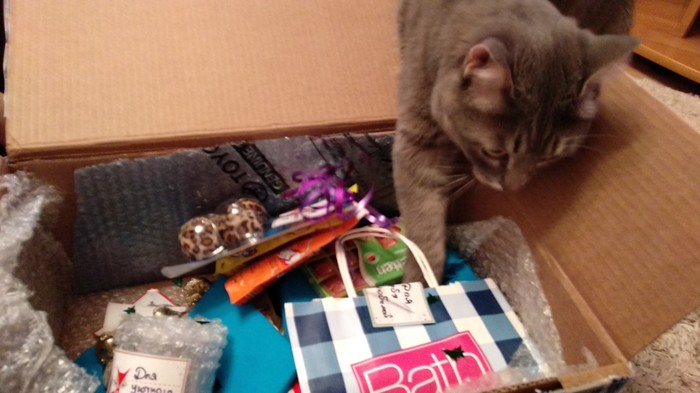 Посылка с подарочками пришла ко мне за 10 дней. Как только принесли извещение, я побежала за ней! Когда я принесла ее домой, вся семья собралась открывать посылку. Мой кот с большим интересом в этом участвовал)
