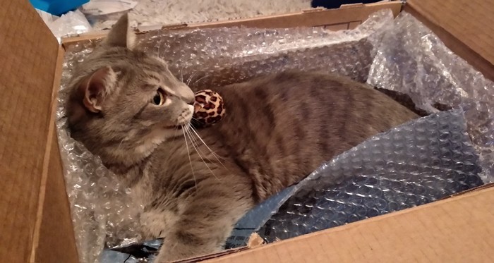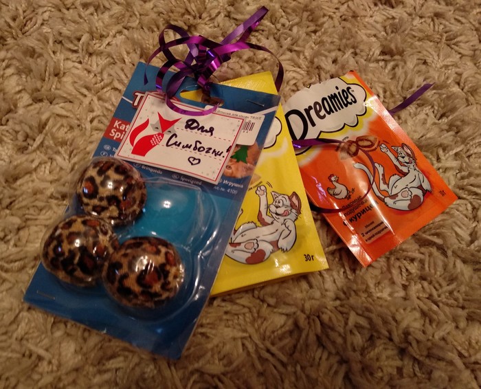 Котя сразу съел вкусняшки и побежал играться с шариком)