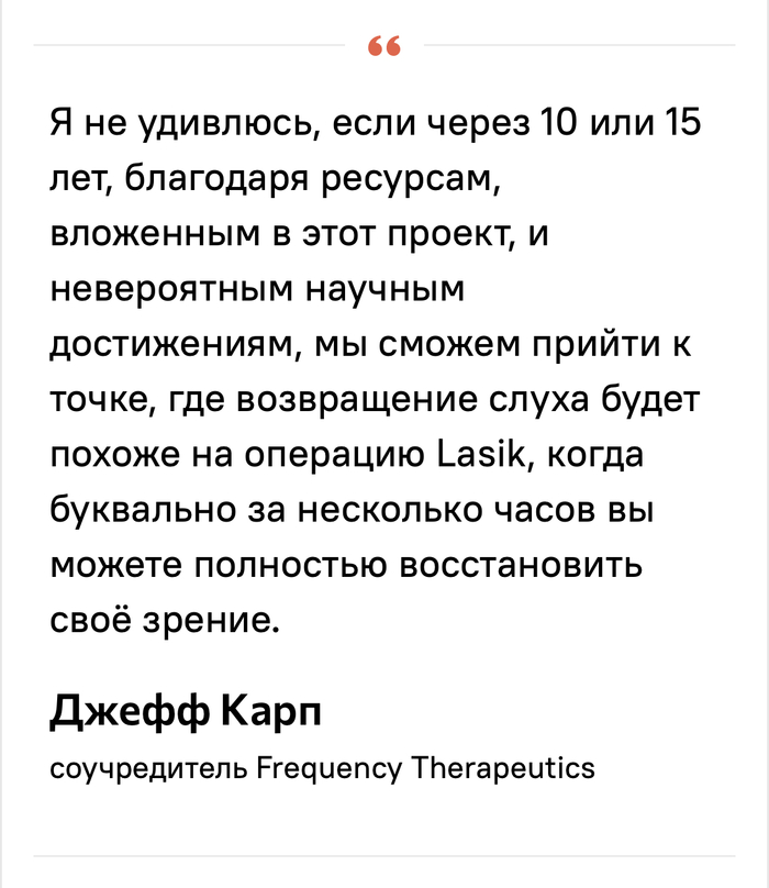 Группа учёных Массачусетского технологического института, возглавляющая биотехнологическую фирму Frequency Therapeutics, сообщила, что разработала новый тип регенеративной терапии, которая способна вернуть слух. И для этого не требуется использование слуховых аппаратов или кохлеарных имплантов.