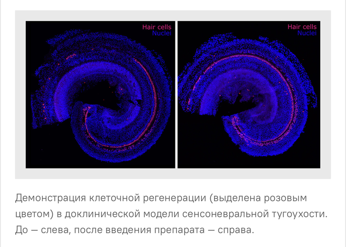 Специальное молекулярное средство Frequency Therapeutics, вводимое в улитку внутреннего уха, делает именно это — оно заставляет стволовые клетки регенерировать эти рецепторы.