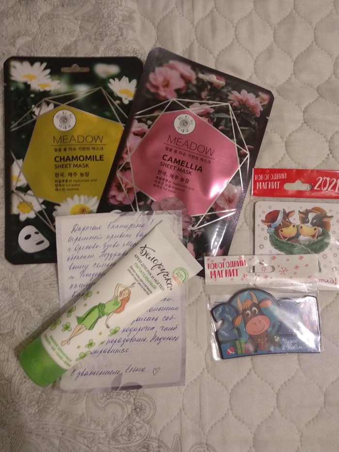 Подарки для красоты - маски и крем, и милые магниты, которые уже висят на холодильнике! А ещё душевное письмо!