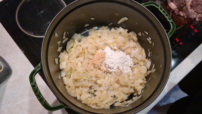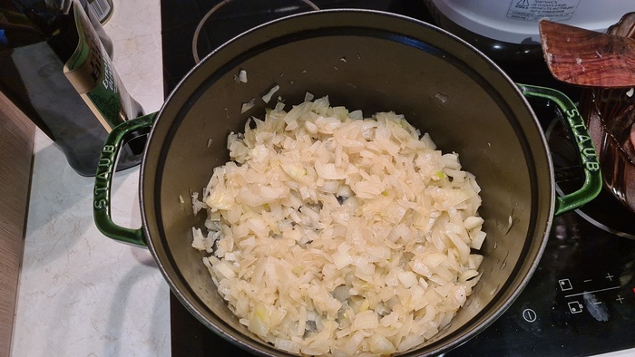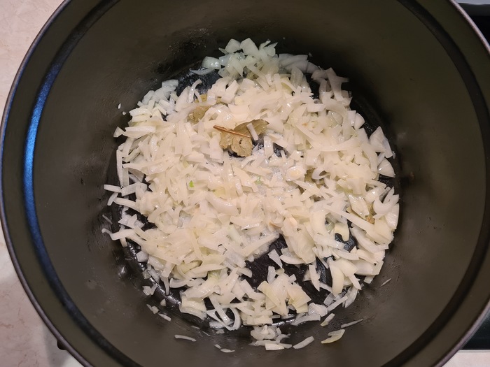 3. Верните жаровню на средний огонь, добавьте лук и щепотку соли в топленый беконный жир и готовьте, периодически помешивая, до мягкости, около 4 минут.