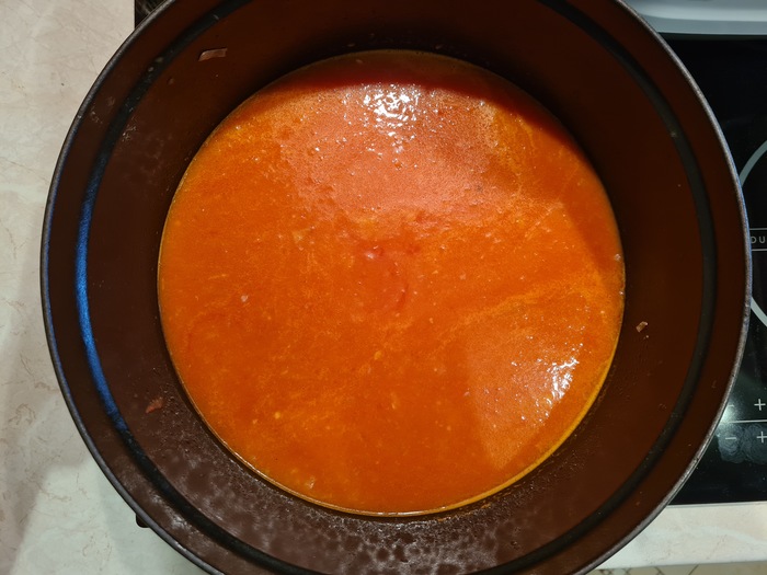 4. Добавьте чеснок и зарезервированную смесь специй и готовьте, постоянно помешивая, до появления аромата, еще около 1 минуты. Добавьте оставшиеся 1 ¼ стакана бульона и доведите до кипения, помешивая и соскабливая дно кастрюли, чтобы ослабить и растворить все подрумяненные кусочки. Добавьте томатное пюре, коричневый сахар и протертую фасольную смесь и перемешайте. Добавьте фарш индейки и разломайте ее на большие куски (она сама больше распадется). Добавьте оставшуюся фасоль и перемешайте. Варите около 30 минут.