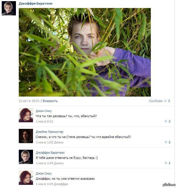Crazy123 найдено на просторах вконтакта 12 лет назад От нечего делать можно почитать диалоги, забавно получилось )))) Игра престолов ВКонтакте Комментарии