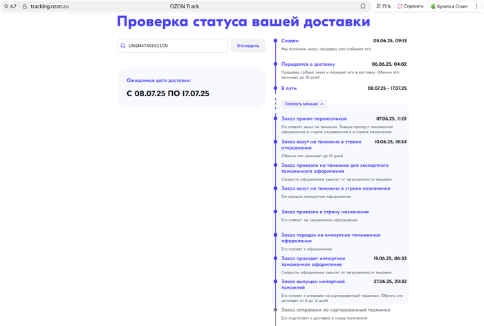 Последний раз движение посылки было на таможне 27.06. Таможня была пройдена и товар отправлен на сортировочный терминал @Ozon О чем радостно сообщил @Ozon в комментариях к 1 части.