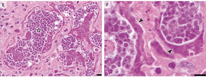 Пациенту был назначен альбендазол, а также АРВТ. Из шейных лимфатических узлов, а также из легких взяты биоптаты. Гистологическое исследование показало наличие в образцах тканей гнезд видоизмененных атипичных клеток, часть из которых была значительно увеличена и имела плеоморфные ядра с множеством ядрышек; а также очагов некроза, ангиолимфатической инвазии.