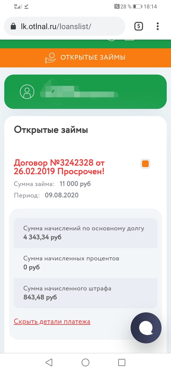 В 2019 взял в МФО "ОТЛИЧНЫЕ НАЛИЧНЫЕ" займ в 11000 рублей, два месяца проплатил проценты, потом лешился работы. В 2020 году наладилось с работой, понимал что просрочка есть, и ждал решение суда для выплаты долга.
