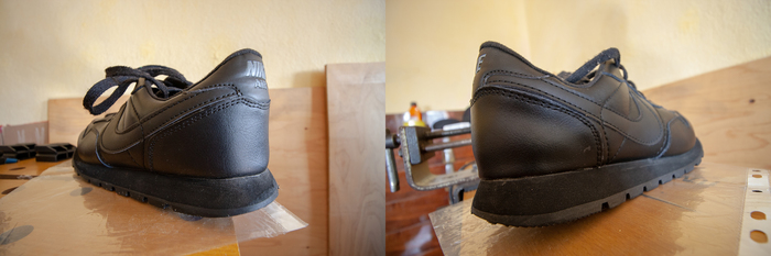 Небольшая проблема возникла при проклеивании основания пятки к нижней части задника - он скошен. Немного подумав стянул впоследствии основание пятки тканевым ремешком, туго обвязав кроссовку вдоль, подержал обувку в таком состоянии часа этак три. Сегодня дождался высыхания и пшёл на улицу.