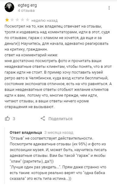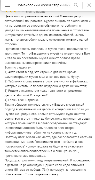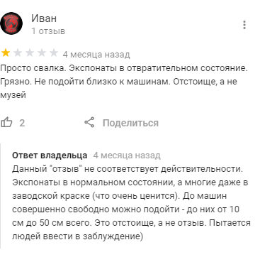 Всегда стараюсь писать нейтрально-полезные отзывы. И в этот раз, как мне казалось, написал так же. Дело в том, что я очень буду рад за фанатов автомобилей, которые действительно могут увидеть желаемое. Чаду моему там тоже понравилось, кроме того, что там правда холодно внутри и автомобили нельзя осмотреть вокруг, о чем я собственно и написал в отзыве. Хотел благое дело сделать и предупредить тех родителей, кто туда соберется.