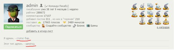 3. Статус бар. Администрация данного ресурса любезно нам предоставила возможность оставлять в профиле пользователя заметки о нем. Но что если я хочу сам рассказать в двух словах о себе, например чем я занимаюсь, или преимущественно какие темы в своих новостях освещаю? (В этом моменте кто-то может подумать что мы таким образом скатимся к уровню ВК, но думаю нет - не скатимся). Сделать аналог заметок, только от пользователя аккаунта - что бы было видно другим пользователям, с ограничением на количество символов, думаю данная функция была бы многим полезна. Надеюсь суть понятна, о чем я, скрин ниже.
