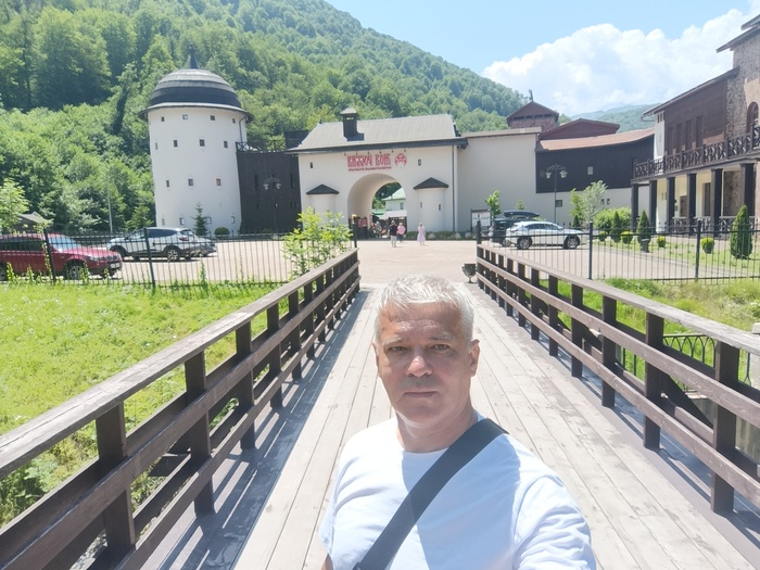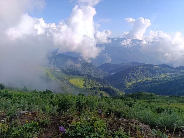 Я там заселился в каком-то жутко офигенном замке, с единственным окном которое выходит на реку Мзымта, а это горная река и она постоянно шумит, такое ощущение что живешь в аквапарке, ну и рядом дорога, но вот дорогу я не слышал (все-таки москвич, у которого всего окна выходили на оживленную улицу). По приезду сразу попал под дождь, мне идти было 15 минут до отеля, а вот он меня поймал. Разложился и сразу пошел на гору по трассе 1 Альпика, просто было интересно как это, прошел примерно 350 метров по высоте, шел где-то 40 минут, опять под дождем, ну тяжеловато, интересно, что встаешь перед практически вертикальной стеной и идешь на нее, в общем интересно по первому разу. Очень помогла обувь для трекинга...