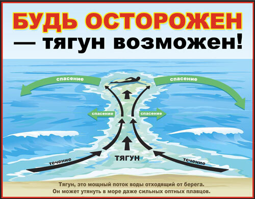 Если вы попали в тягун, не пытайтесь плыть против него. Скорее всего, у вас это не получится (скорость потока достигает 3 м/сек). Обычно ширина отбойного течения небольшая. Чтобы спастись, достаточно немного проплыть вдоль берега, и только течение перестанет ощущаться вернуться на берег.