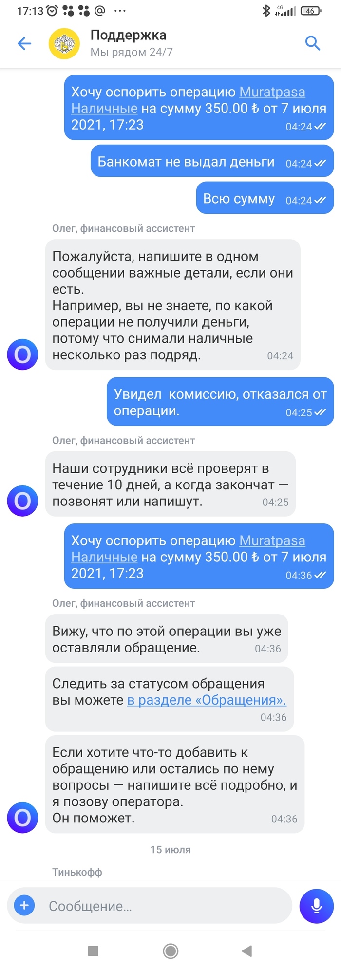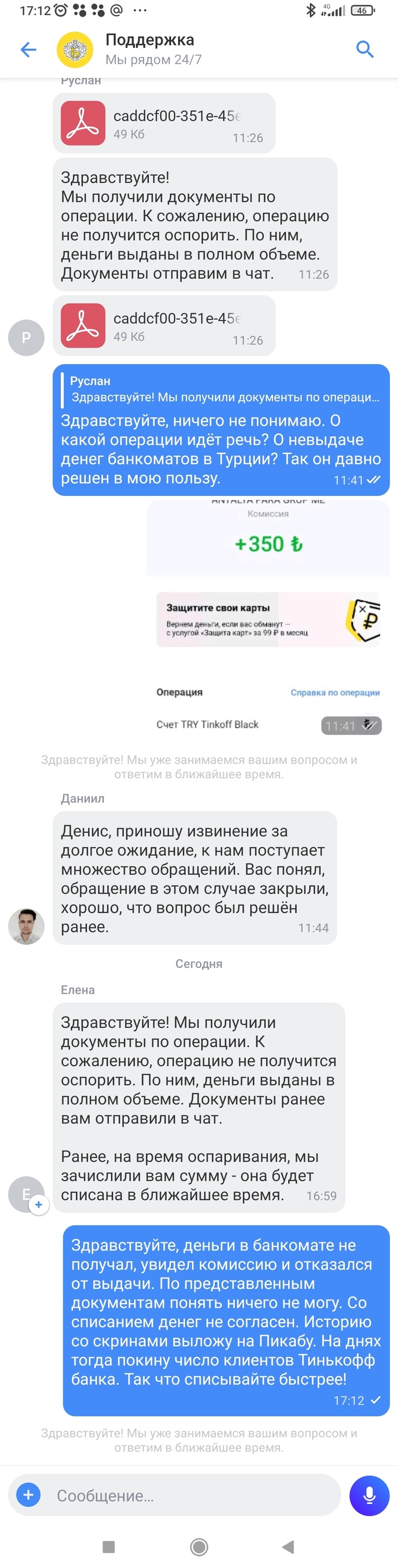Так вот, дело то собственно в чем. Собрались мы семьей в июле к туркам у моря погреться да решил я воспользоваться предложением от банка сделать карту мультивалютной да в лирах, что бы денежку в банкоматах снимать и картой платить в лирах, да и без коммисий. Прилетев в аэропорту решил сразу снять лир немного пусть будут. А банкомат басурманский сказал мне что он возьмет комисию 7%, но не понравилось мне это щедрое предложение, отказался я, и пошел к второму банкомату где история собственно повторилась. А на следующие сутки деньги которые я в банкомате не брал списались, пожаловался я в чате соратникам Олеговым на несправедливость сию. Ну а те обещали разобраться дней за 10 да не дать меня в обиду.  Разобрались вернули деньги в акурат когда я от басурман вернулся. Ну а зачем мне лиры в России, ну и поменял я их обратно на рубли, соответственно потеряв немного денежек на конвертации туда обратно. Обидно чуть ну да ладно, бывает. Я уже и забывать начал об этой истории, в середине июля дело было. Но не тут то было, пишут мне вчера соратники Олеговы что прислал им басурманский банк документы  по которым деньги банкомат мне выдал и деньги они взад заберут. По документам скрины которых они мне предоставили понять ничего не смог. Написал что не согласен и историю сию на пикабу опубликую, вот и пишу). Сумма в общем то невеликая совсем 350 лир, но как то досадно. Спишут деньги не спишут, все равно быть клиентом Тинькофф банка, более как то не хочется, хоть сложно конечно что то утверждать, может это у турков такие банки не хорошие. Скрины прилагаются. Посоветуйте пожалуйста банк с хорошим кешбеком и процентом на остаток.