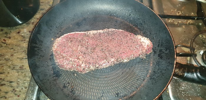 Когда сковородка расскалится, кидаем мясо на нее на 1-1.5 минуты - до образования коричневой корочки, переворачивам и жарим еще столько же:
