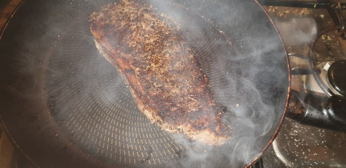 По истечению 40 минут, берем сковродку и разогреваем на максимальном огне. Можно налить чуть-чуть масла на сковородку (чуть-чуть! первый раз я налил оооооочень много масла и еще и не просушил мясо, я немножко устроил фаерболл), но не обязательно - мясо само достаточно жирненькое.
