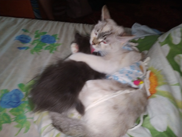 Поначалу старшая кошка отнеслась не очень дружелюбно, но буквально через неделю они были неразлей вода(старшая была записана на стерилизацию буквально на следующий день после того, как забрали маленькую)