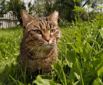 Несмотря на отсутствие у нее кистей всех лап, эта котя любитель весело и быстро ускакать в дальние дали. Платочек на ней- чтобы легче было ее видеть в разнотравье. Гуляет только под присмотром по огороду.