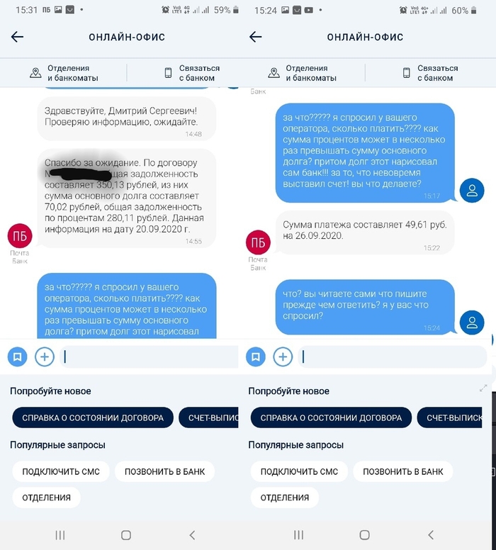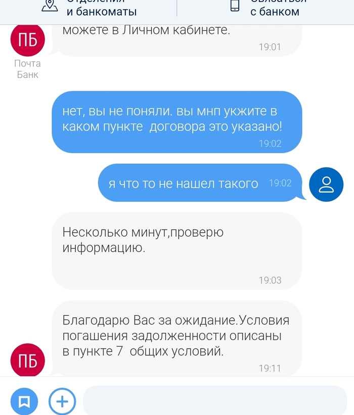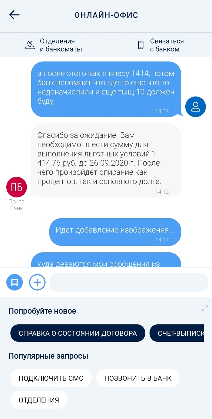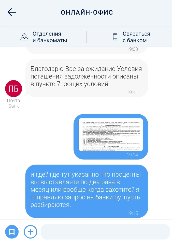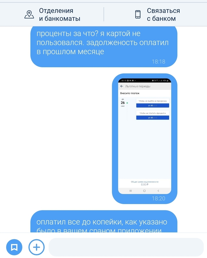 все это время я задавал вопрос почему на долг который банк потерял сам по своей вине, были начислены проценты, записаны как основной долг и на них сверху еще ежедневно начислялись проценты. ежедневно в чате писали: вы должны такую сумму, платите, никаких разъяснений, кроме того что был сбой.