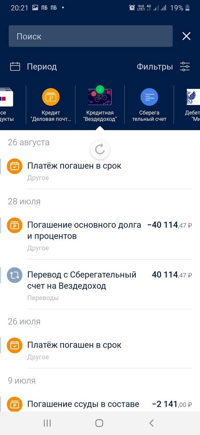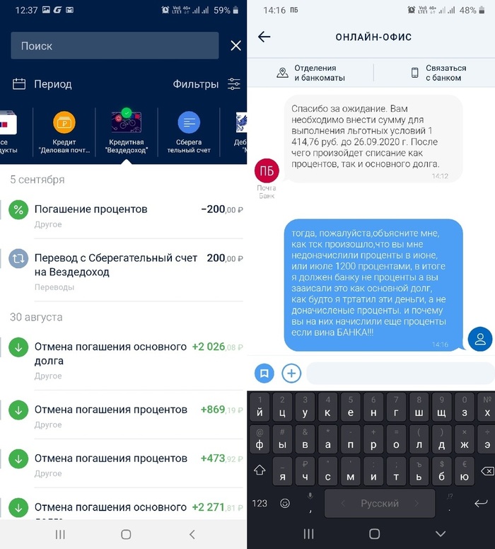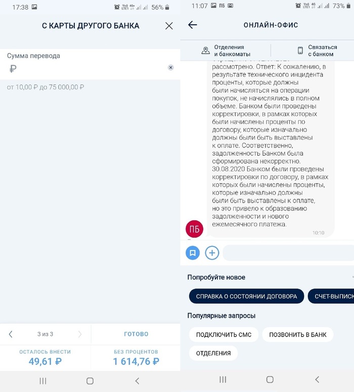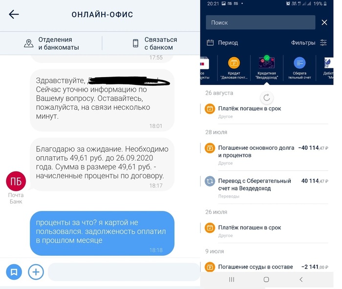 Добрый день. 28,07,2020 я внес на карту почта банка 40147,47 копеек, для того что бы погасить задолженность по кредитной карте. именно такую сумму мне выставил банк для оплаты основного долга и проценто. я из приложения нажал кнопку пополнить карту для погашения что бы не платить проценты. деньги зачислены в тот же день, через сутки в приложении указано что задолженности 00 рублей 00 коп. Карту планировал закрыть в конце августа, что бы в сентябре не успели списать годовое обслуживание (26,09,2020 должно было бы списаться) но я увидел в приложении по состоянию на 27,08,2020 я должен банку 49 рублей. банк не смог дать ответ, зато 30,08,2020 делает корректировку счета на 1614,76 ( выяснил 02,09,2020 в офисе банка что был сбой и с меня недосписали процентами 1152 рубля.) там же выяснил что для закрытия карты я вообще должен оплатить 2050р