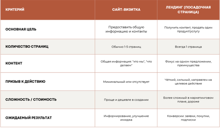 Различить сайт-визитку и лендинг бывает сложнее всего, ведь оба формата просты, состоят из одной или нескольких коротких страниц и направлены на конкретное действие пользователя. Однако у них разные цели: сайт-визитка служит представлением компании, специалиста или бренда, а лендинг создаётся для продажи одного продукта или услуги. Чтобы наглядно показать основные отличия, приведём сравнительную таблицу ниже: