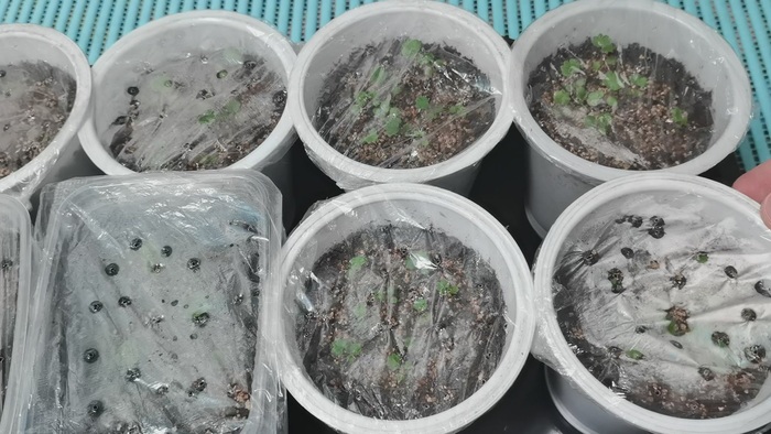 Поливаю раз в 3 дня, сверху немного смачиваю почву. Сверху стаканчики всегда накрыты пленкой.