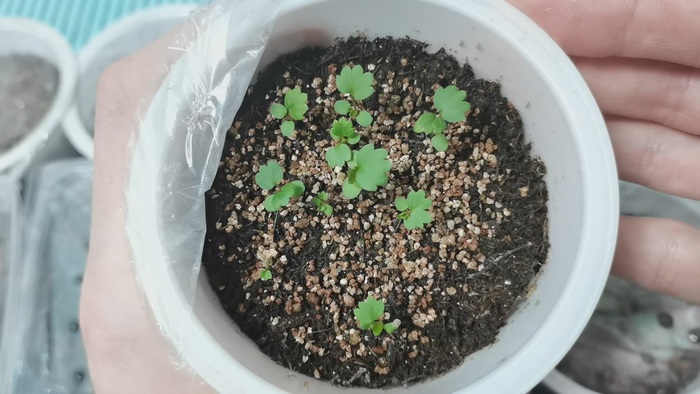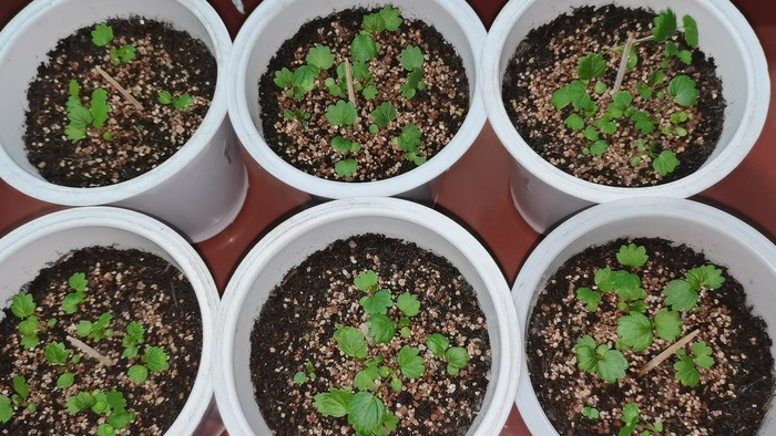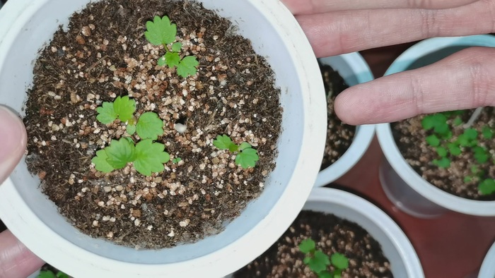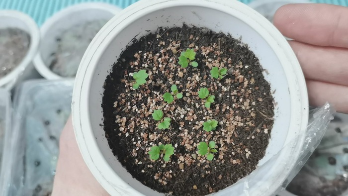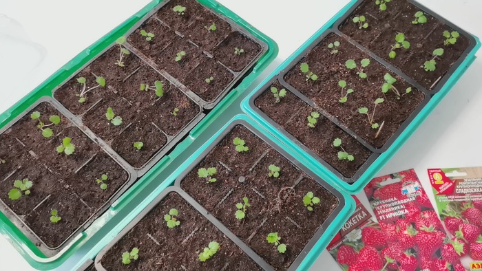 Больше всего вышло рассады земляники Иришка, семян было 55, взошло, примерно 40.