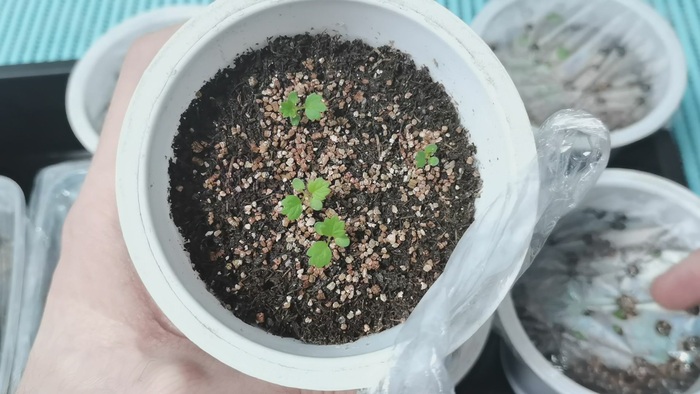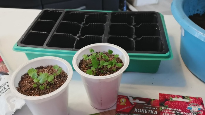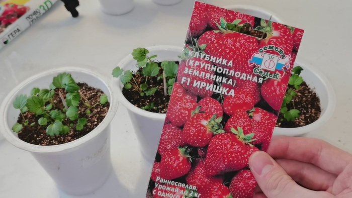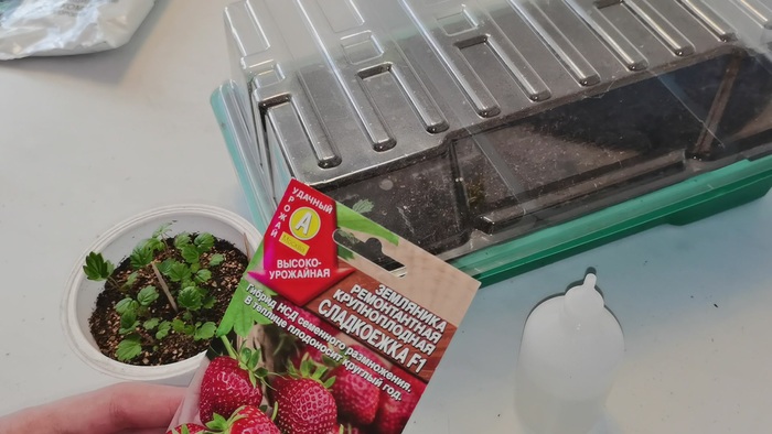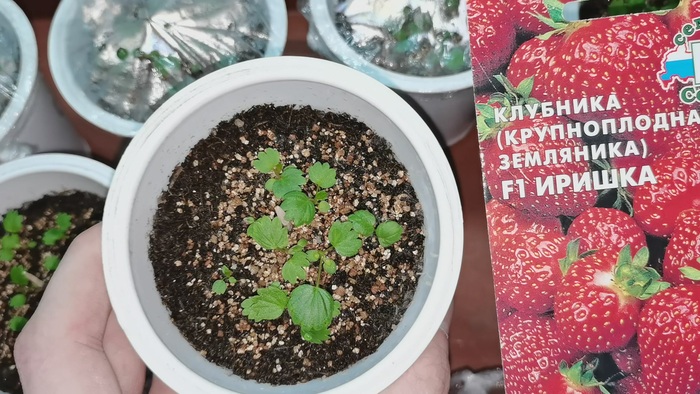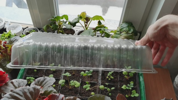 Под крышкой-тепличкой растет земляника из семян, посеяна была 3 января, сорт Иришка.