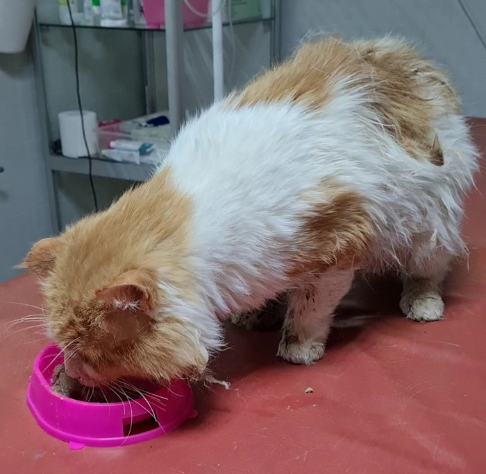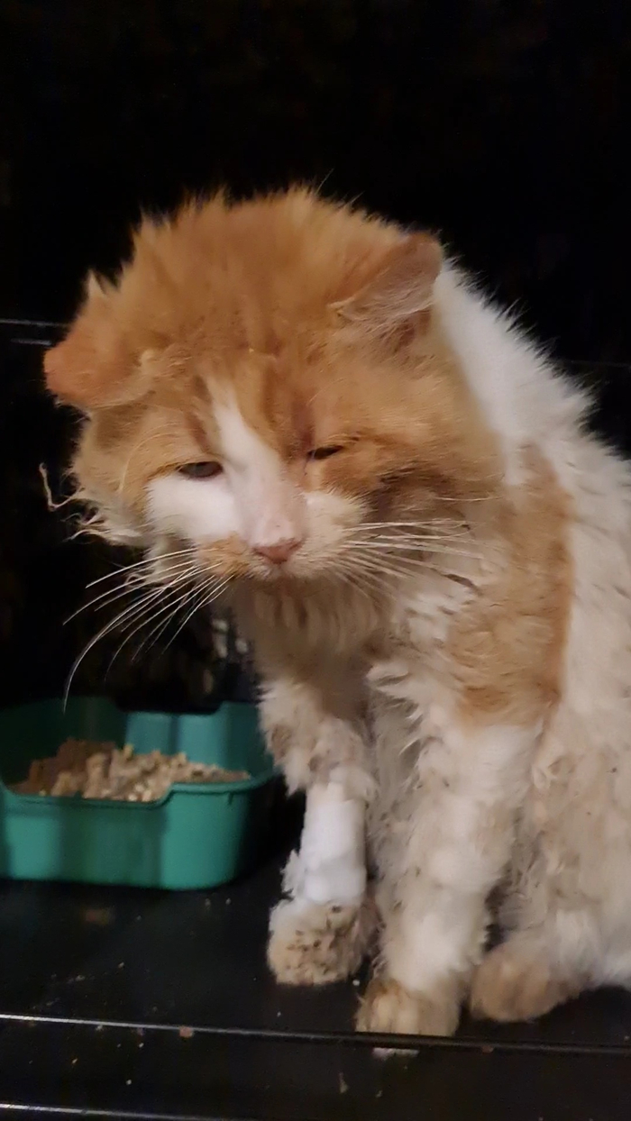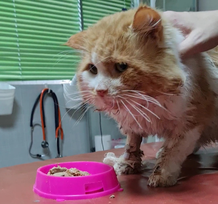 Рыжик чувствует себя уже значительно лучше, появился аппетит, интерес к окружающему миру. Перестал пахнуть канализацией, немного начал себя чистить, но во рту обнаружились язвы, так что ему пока трудно это делать.