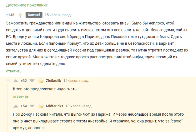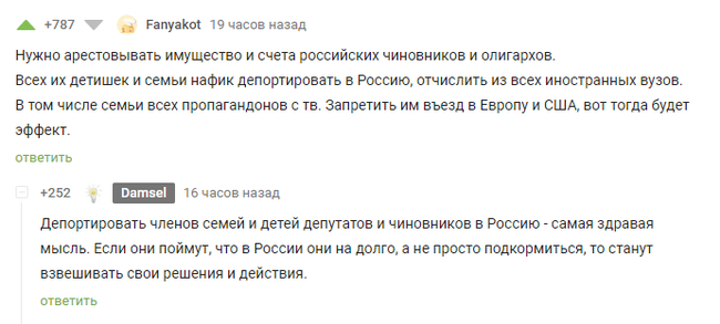 Пишите им НА АНГЛИЙСКОМ! чтоб вернули вашу элиту с семьями назад. Пока что крайними остаются простые россияне. Не надо никаких угроз оружием, эмбарго и дополнительных санкций, пусть просто вернут их домой, чтоб они разделили участь тех, в чьих интересах они решают сегодня то, что решают.