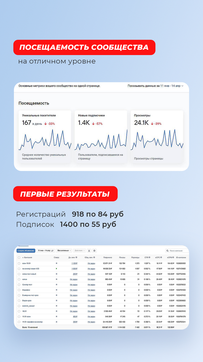 • нужна регулярность и время на раскачку (спустя первый месяц у нас было всего 3 тыс показов)