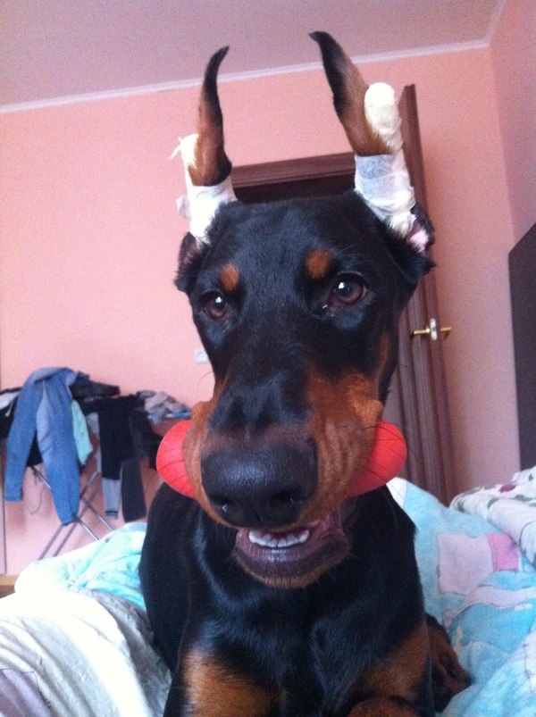 Ушки купировали. На голове специальная конструкция, защищающая уши от лап, поддерживающая уши в вытянутом вверх положении.