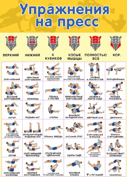 Пресс: если на картинке ниже поискать, то оно называется "колени к локтю сидя". Я, почему-то, называл "велосипед". 3 по 30.